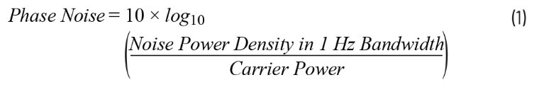 在RF应用中,高性能PLL的性能主要依据一项关键指标予以评估,即相位噪声。相位噪声的计算方式为,将1 Hz带宽范围内的噪声功率相对于主RF信号功率做归一化处理,其详细定义如公式1所示。