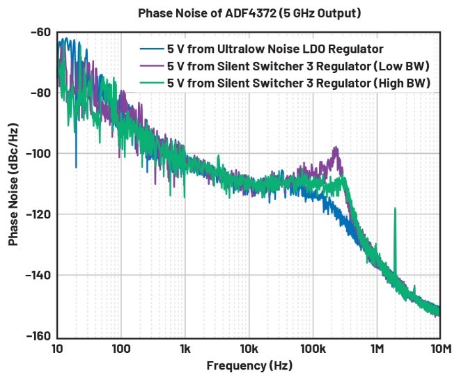 因此,相位噪声始终为负数,其值越低越理想。相位噪声的单位是dBc/Hz,其中c表示该值是根据载波功率进行归一化处理所得。如图1所示,ADF4372需要两条电源轨,分别为3.3 V和5 V。其中,5 V电源轨的敏感度最高,因为它为PLL内部的压控振荡器(VCO)供电。4在本案例研究中,3.3 V电源始终由超低噪声LDO稳压器(LT3045)供应,而5 V电源则由Silent Switcher 3稳压器驱动,旨在研究Silent Switcher 3稳压器对RF输出信号相位噪声的影响。
