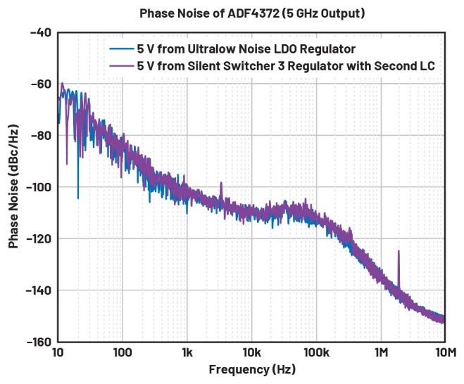 如图4所示,配备了所设计的第二级LC滤波器后,基于Silent Switcher 3稳压器的解决方案所实现的相位噪声性能,几乎与采用超低噪声LDO稳压器的两级解决方案相当。如图5所示,所设计的第二级LC滤波器进一步提升了由Silent Switcher 3稳压器供电时的相位噪声性能,使得在10 Hz到10 MHz的频率范围内,与超低噪声LDO稳压器的效果几乎相同。尽管由Silent Switcher 3稳压器供电产生的相位噪声结果在2 MHz处因开关频率的缘故仍然存在一个微小的杂散信号,但这个杂散信号的频率是可预测的,且与载波频率相距较远,因此并不难处理。