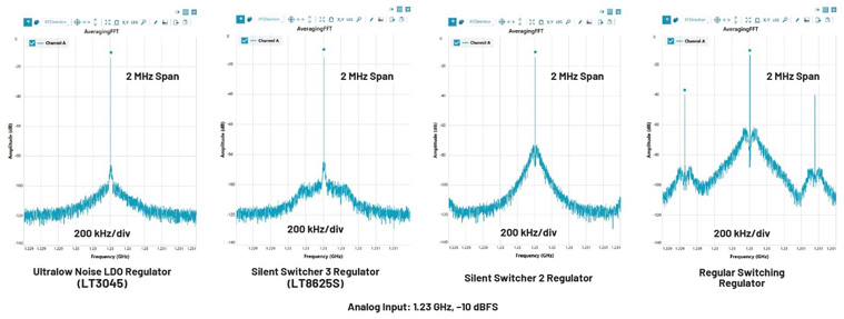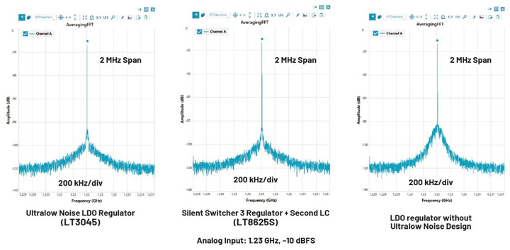 在此ADC案例研究的第一部分,我们研究了ADC系统的性能,以及将Silent Switcher 3稳压器用作PLL时钟电源所带来的优势。同样,ADF4372的3.3 V电源轨始终由超低噪声LDO稳压器(LT3045)供电,而5 V电源轨则由Silent Switcher 3解决方案或其他电源解决方案供电。此外,AD9208始终由安装在标准演示板上的默认电源解决方案供电。在相同的模拟输入信号条件下,图8展示了在不同PLL时钟电源供电时,ADC输出信号在1.23GHz附近的平均快速傅立叶变换(FFT)结果,其频率跨度为2MHz。与其他开关稳压器相比,Silent Switcher 3稳压器能够让ADC实现最佳的性能,并在1.23 GHz附近具有最低的噪声,尽管其FFT波形在频率偏移约250 kHz处仍有一个平台区。