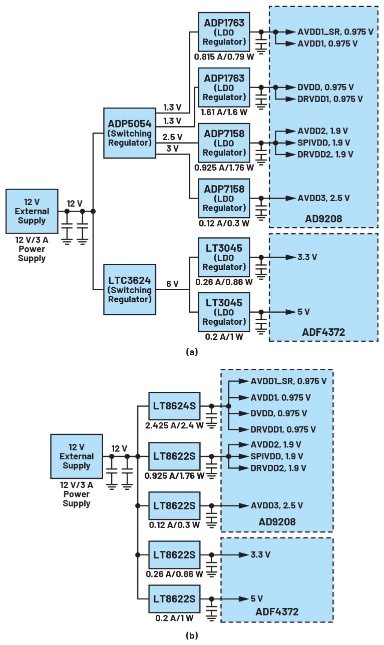 图11.ADC系统的原始电源树与新型电源树(AD9208 + ADF4372)对比:(a)原始电源树(降压式稳压器与LDO稳压器组合而成的两级解决方案);(b)新型电源树(基于Silent Switcher 3技术的单级解决方案)。